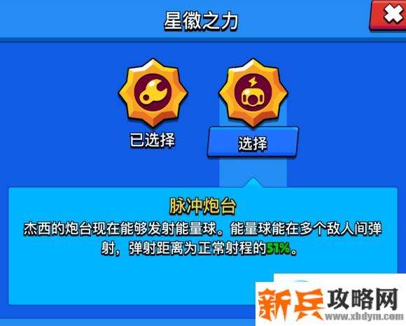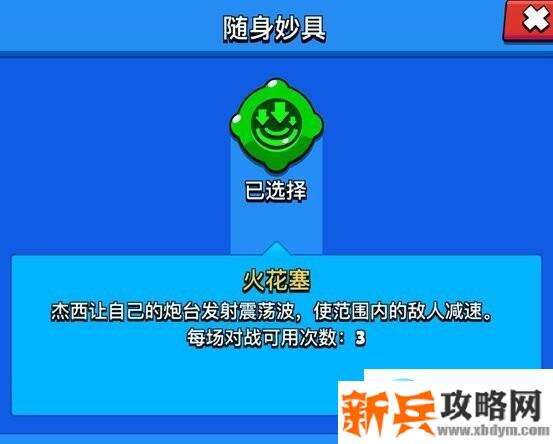 杰西的秒具是让自己的炮台发射震荡波,使范围内的敌人减速。所以她的妙具触发效果必须要使用超级技能后才能使用,无炮台时无法使用妙具。杰西的妙具一定程度上弥补了她的追击和逃生能力,每场对战可使用3次。