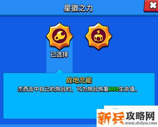 “战地充能”将赋予杰西修补炮台的能力,她的能量球击中炮台时,可以为炮台恢复800生命值,并且能量球在修复完炮台之后依然会弹向敌人并造成伤害。可以利用炮台当做跳板,攻击更远处的敌人。