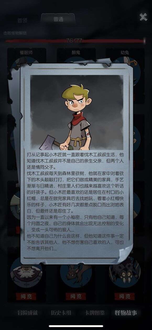 本版本的新职业,可谓男猪脚,情窦初开对小红帽一片痴心的小男孩,与伐木工叔叔有关联对话,之前版本伐木工会说他名字叫杰瑞,每到月圆之夜就消失,在上一版本就埋下了伏笔,原来是变成了狼人,开发者们用心了,他自己也会触发对话,问小红帽“非去不去么?”