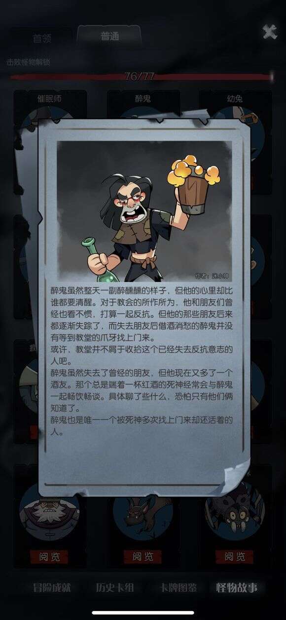 建议打法:怪物等级大概在lv1-lv3之间,出场自带一张【荆棘甲】反弹30%的物理伤害,有一张特殊牌【干杯!!】抽3张牌,双方丢弃所有非攻击牌。反弹伤害没办法,也是直接撸,但是需要注意的是,打他不要用力过猛,比如,玩骑士最后一下一激动给了个【处决】......