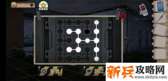 提示就是茶几上那个箱子盖上的图,意思是用黑白棋填满格子,同色棋子只能单线连接,不能田字形双线连接,而且还规定了三颗黑子和白子不能动,所以就只能这样连了。这里过关后,门禁刷卡才生效,否则刷不了卡。
