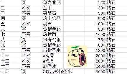 深海沉银,觉醒钥匙,S戒指圣水必买,其他可以不买,具体可以参考我搬来的图