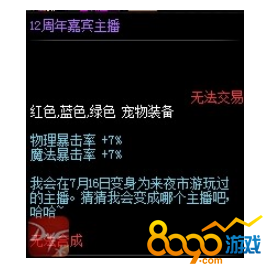目前这个宠物的外观还没有爆料出来,所以无法展示出宠物的外观。这个宠物大家获得之后的话在7月16日的时候才会变身的,随便变成一个主播,大家可以期待一下哦。这个宠物主要是有三种颜色,一种是红色的,一种是蓝色的,一种是绿色的。属性的话是:物理暴击率+7%和魔法暴击率+7%。