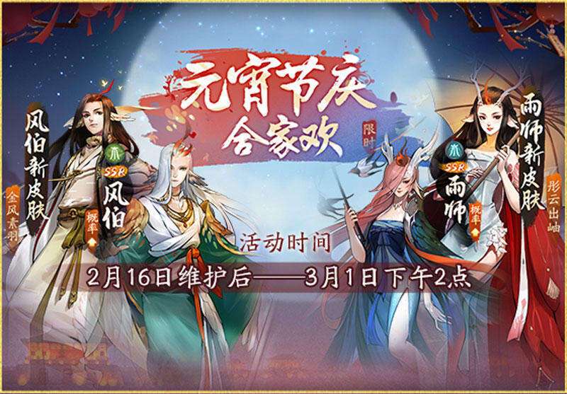 2月16日,网易新概念妖灵大作《神都夜行录》已正式上线“元宵节庆合家欢”全新限时活动!除了海量免费福利等待降妖师们前来领取之外,游戏还上线了超人气妖灵风伯雨师的全新限定皮肤。并且家园系统也已开启全新奇缘玩法,提供更多互动选择!