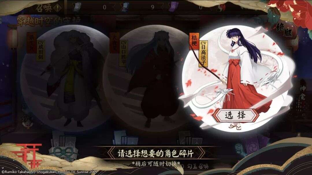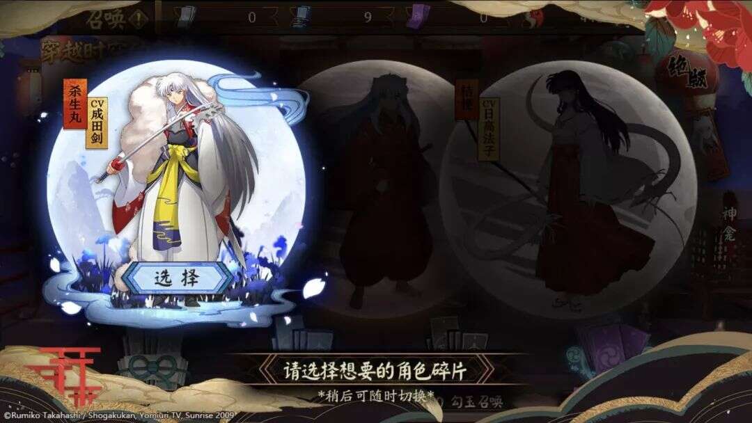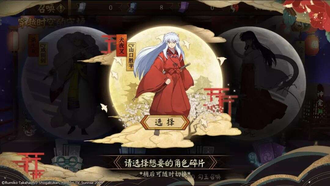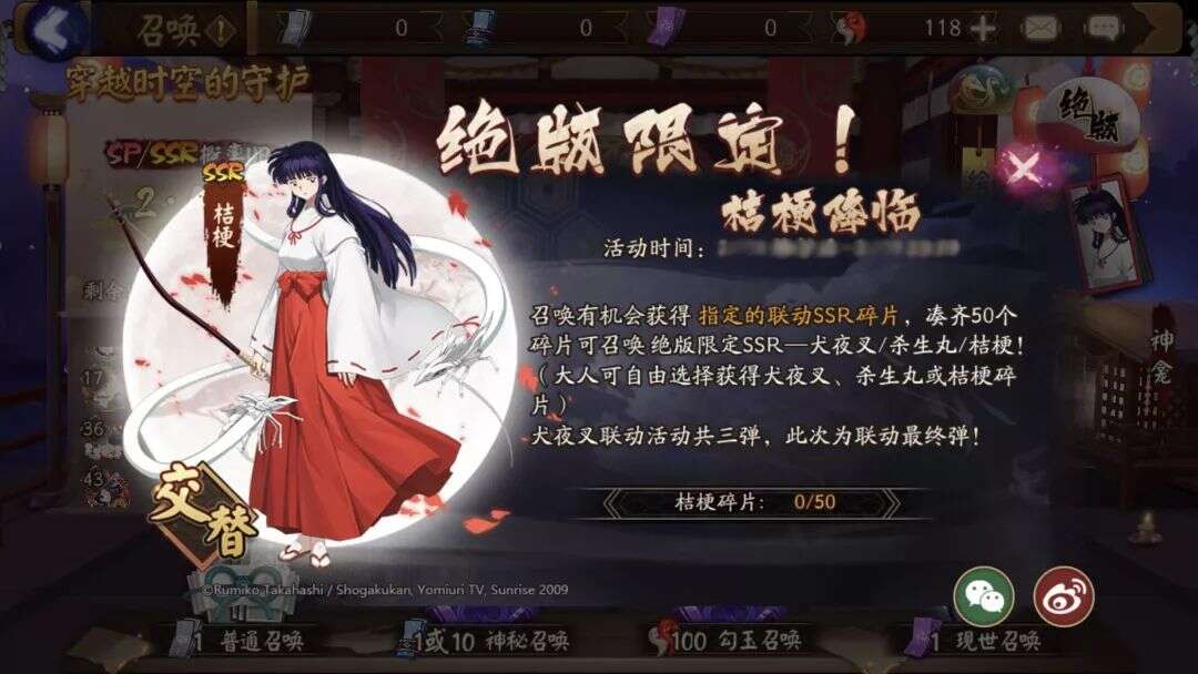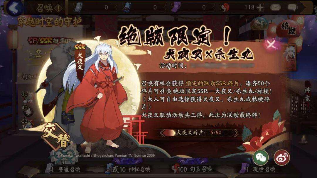 2月20日维护后-2月26日23:59,使用神秘的符咒、勾玉、现世符咒召唤,即有机会获得犬夜叉、杀生丸、桔梗碎片。集齐50个犬夜叉、杀生丸、桔梗碎片即可合成对应的绝版限定SSR!