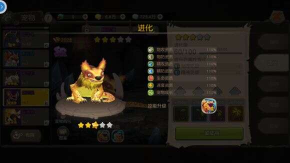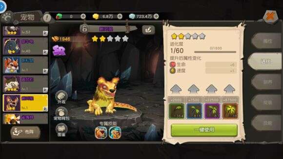 在宠物界面下,进化一栏可以查看当前宠物的进化度,以及每次提升后属性的变化情况,可以点击使用进化道具来增加宠物的进化度,也可以直接点击一键使用,来使当前进化度达到满级。