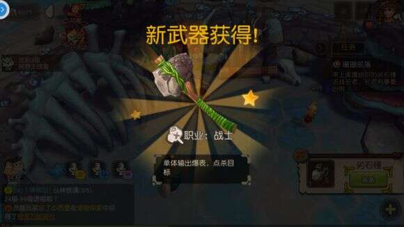 在与库嘎进行对话之后,会得到自己的第一把武器——劣石锤,装备之后自动成为战士职业。