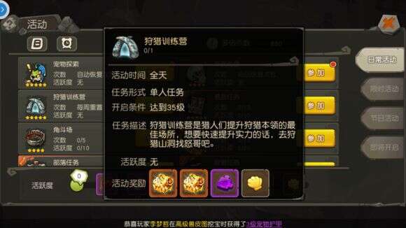 狩猎训练营是疯狂原始人中非常常规的一个活动,玩家通过挑战狩猎训练营中的层层关卡,在锻炼自己战斗技巧的同时,也可以获得对应的狩猎礼包,打开狩猎礼包可以获得各类培养宠物所需要的极品道具。
