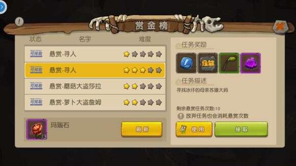 刷新悬赏任务需要消耗玛瑙石,玛瑙石可以通过完成丛林惊魂副本和狩猎训练营获得,也可以在玉贝商店和角斗场商店中购买获得。当悬赏列表中的任务全部处于可接取的状态时,刷新需要消耗3个玛瑙石;完成1个时,刷新需要消耗2个玛瑙石;完成2个时,刷新需要消耗1个玛瑙石;完成3个时,刷新不需要消耗玛瑙石。注意:放弃任务也会消耗悬赏次数。