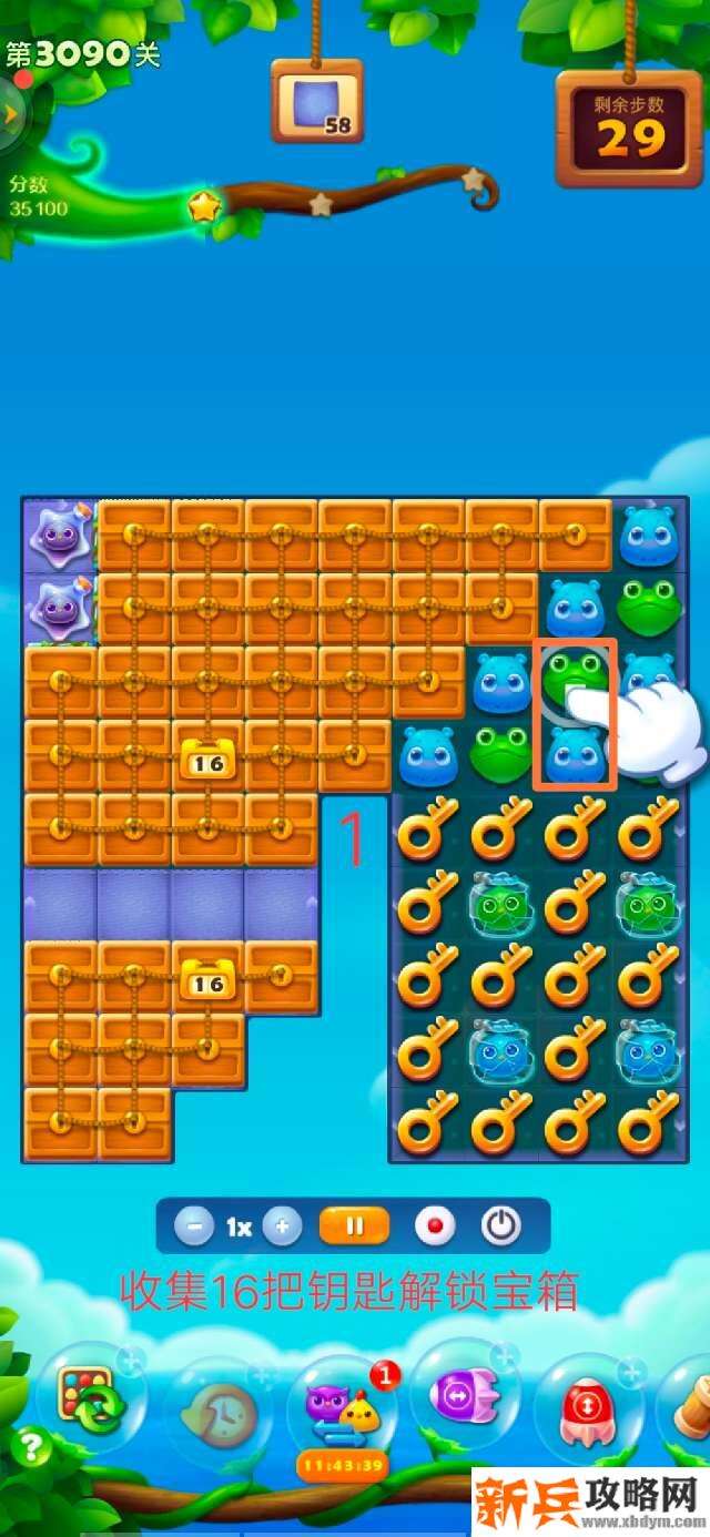 1.收集16把钥匙解锁宝箱后,盘中被一层右向6块簿冰分隔成"T"字型三个部分:上部覆盖两层精灵罐,左侧动物由下向上掉落,右侧覆盖树叶,同时开始布局抹奶油;