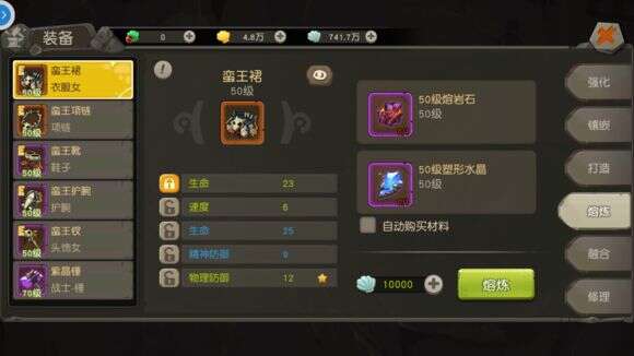 普通的熔炼只需要消耗装备对应等级的熔岩石以及少量银币,如果需要锁定属性的话,那么还需要额外消耗对应等级的塑形水晶,每锁定一条属性需要消耗一块塑形水晶。当道具齐全之后,点击熔炼即可对装备的属性进行洗练。