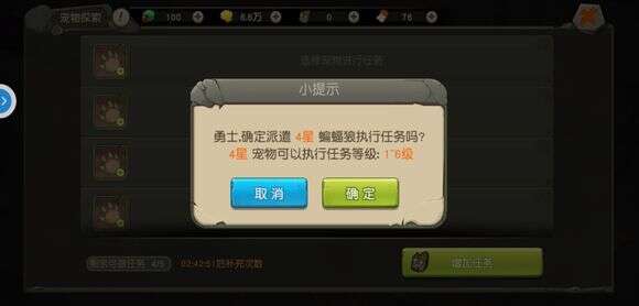 所有的宠物都可以被派出,点击加号选择派出的宠物后,系统会自动分配任务。不同星级的宠物可以分到的任务等级也不同:1星的宠物可以执行的任务等级为1-3级,2星的宠物可以执行的任务等级为1-4级,以此类推。