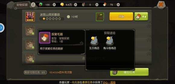 如果对系统派发的任务不满意,可以通过探索毛刷刷新,分配新的任务。一般来说,任务等级越高,所需的时间越多,奖励用丰厚。使用金贝可以加速任务完成。