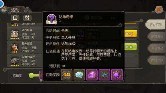 咕噜奇缘是游戏中为数不多的不用战斗的活动之一,在玩家达到26级即可开启,通过答题可以获得加工灵石和蓝珊瑚等道具,活动每天都可以完成。