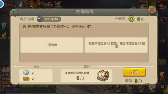 每次任务玩家需要在规定的时间内答5道题,当遇到不会的题目时,可以点击界面中的求助按钮向部落中的族人进行求助,每次答题一共有3次求助机会。所遇到的题目基本上也是一些游戏中的常识,例如下图中,此处答案应选第二个,基本上“没有用”和一些恶搞的答案都可以排除。