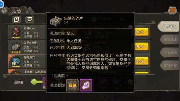 失落的碎片为单人任务,在玩家等级达到30级即可解锁,全天一共可以完成6次,在岩洞部落的艾哥(162,110)处接取任务,完成任务后可以获得大量经验和拼凑石板的碎片。