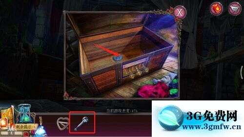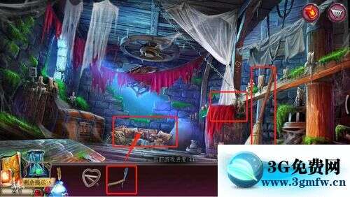 接下来用扫帚扫掉下图箭头指向的箱子上的蜘蛛丝,并用钥匙串打开箱子。