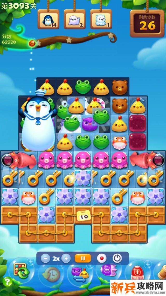 固定开局,激活气鼓鱼,消除冰层,消除毒液,毒液需要蔓延一个,才能收集齐,激活章鱼,章鱼激活后,快速收集所有🔑,解锁箱子区域,然后快速向下,多种组合消除下方的冰层,雪层,冰块,释放海洋生物,最下一层比较难消,步数不多,烂尾严重,往往都差一个🧊,不能过关,祝福好运!