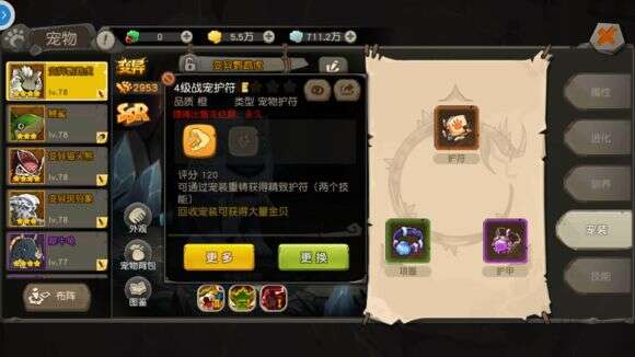 打开宠物界面,选择宠装一栏,可以看到宠装分为护符、项链和护甲三个部位。其中护符可以为宠物附加额外的被动技能;项圈随机附加属性,护甲附加防御属性,与人类有所不同,宠装只有绿蓝紫橙色四种等级。