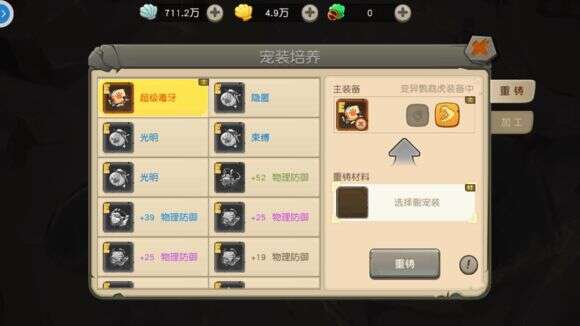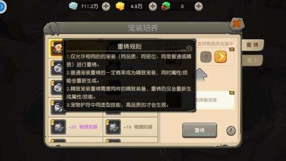 重铸宠装是将相同品质、部位、同时普通或精致的宠装进行合成,普通宠装重铸后会有一定几率成为精致宠装,同时属性/技能会重新生成;精致宠装重铸需要同样的精致装备,重铸后仅会重新生成属性/技能。宠物护符中同类型技能,只有高品质的才会生效。
