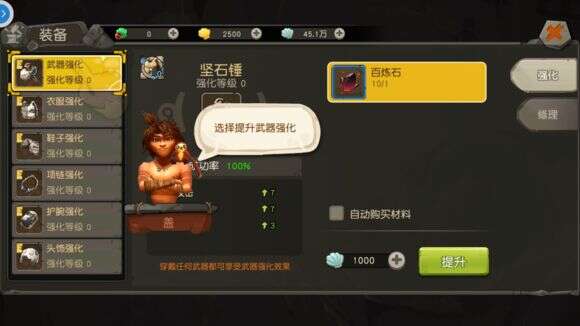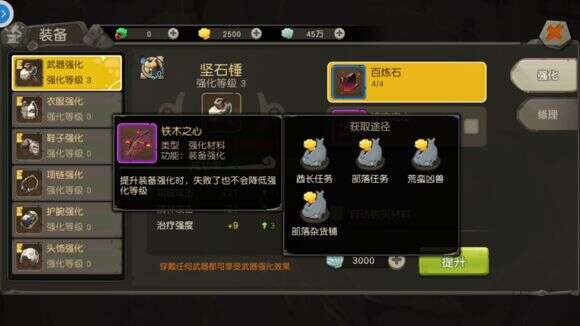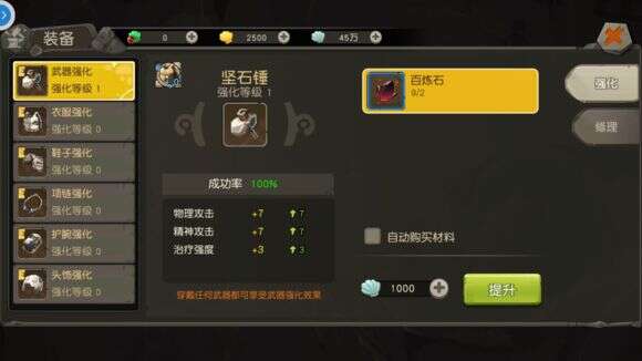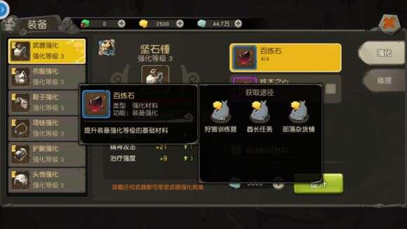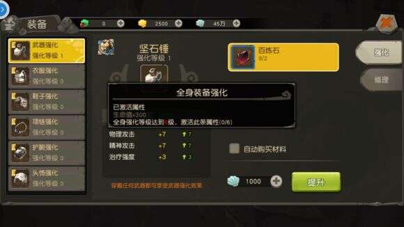 在选择指定的装备部位后,点击提升,即可进行装备强化。在前期,装备强化需要消耗百炼石和少量银贝。