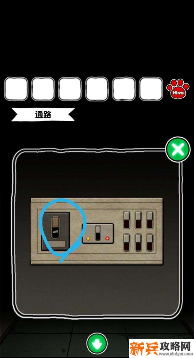 7.去走廊,点击中间的门,会提示黑漆漆的,使用手电,发现配电箱,点击最左边带off字母的按钮,打开总电闸,看到左右各有一个房间,右边房间带锁暂时无法进入。