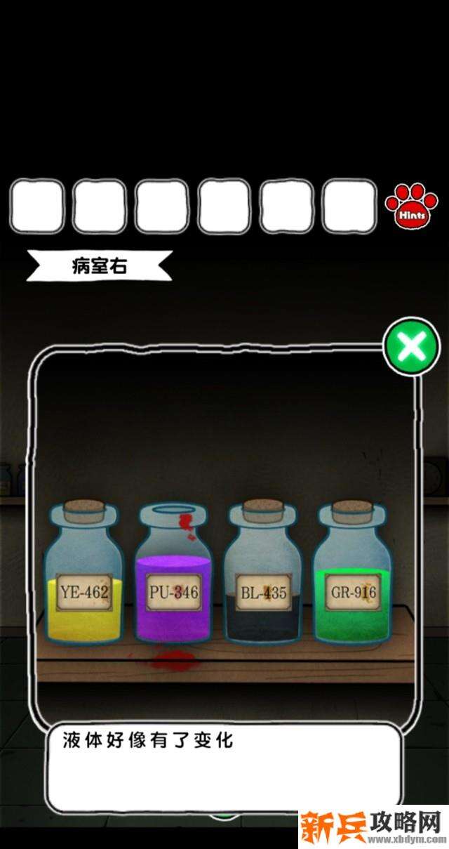 18.点开病室右左侧的四个瓶子,对中间唯一没有塞子的蓝色瓶子使用注射器,蓝色瓶子变成紫色。