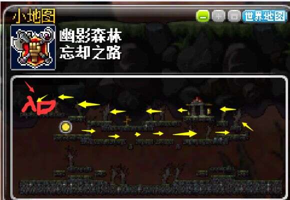 来到忘却之路中间地段台阶,图14,在台阶上向右边台阶跳过去,顺着台阶就可以跳到左上角。图15