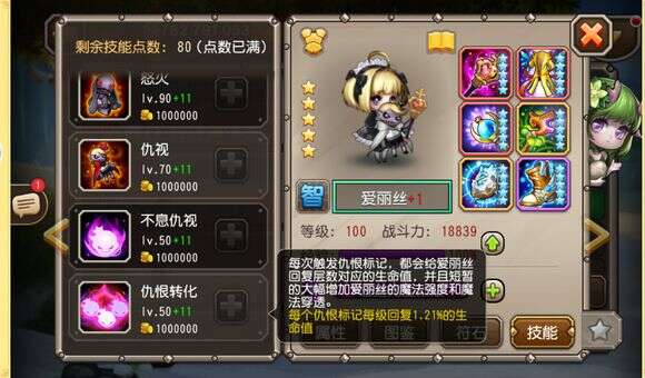 爱丽丝的二觉装备堪称史上最强,具体的加成有多少就不再一一列举了,图里什么都说明了,而爱丽丝也因此总战力跃居二觉英雄第一(这还是爱丽丝没有学院书籍加成的情况下)。属性方面,装备+3斗牛携带三个大件信使装备的爱丽丝拥有接近9w的面板血量,护甲超过了1700,魔抗也超过了1100点,还有觉醒技能的加持双抗,生存属性除了闪避只有5点略有不足,前排非泰坦英雄几乎是第一了,输出方面超过12000的法强,1100点的法爆,除了法穿35点不太够看以外,输出属性也算是比较不错。这里多说几句,爱丽丝的基础法强和法穿其实并不高,换几个法师,比如dp仙女龙比一下发现都比不过,但是优点是超高的法爆属性(五星魔女都比不过),再加上技能的法强加成,总体来说作为一个法师,输出属性还是比较优秀的。而决定暴击与否,主要取决于基础伤害(法强影响),法术暴击和敌方抗性(法穿影响)三个方面,所以超高的法爆属性决定了爱丽丝的暴击率不会低,甚至目前观察的结果来看,很少不暴击……二觉技能,描述如图。