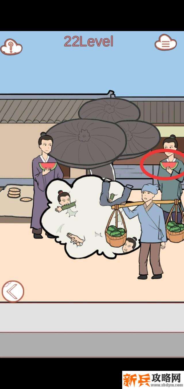 用猴哥,逗这俩人,出现打斗剧情,得到真吃瓜群众的无籽西瓜,之后回到第一场景,拖到猴哥到西瓜,变成有籽西瓜(提醒大家吃瓜要吐籽,233333),喂给假如来,过关