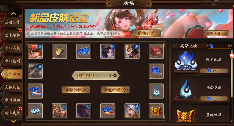 皮肤活动界面调整为皮肤转盘活动、每开启任意皮肤包获取1张皮肤,均可以获取积分,使用积分参与皮肤转盘活动,可以获取各类道具,其中获得的碎片,可以在右侧奖励中兑换道具。