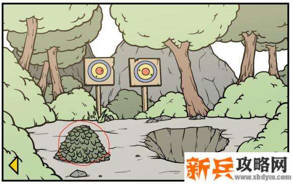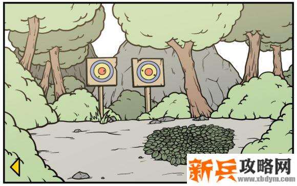 场景2 有一个陷坑,两个靶子,与一堆落叶,落叶可收集,对靶子开枪会把场景1左侧的守卫吸引至此查看