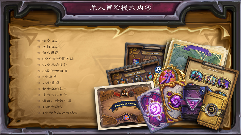 我们收到了关于地下城冒险模式的如潮好评,它也将作为今年的冒险模式的基本框架。不过这一次,游戏的自由度更高,每个职业可以解锁多个初始套牌和英雄技能;此外我们还加入了旅店遭遇,你可以在此微调你的套牌。