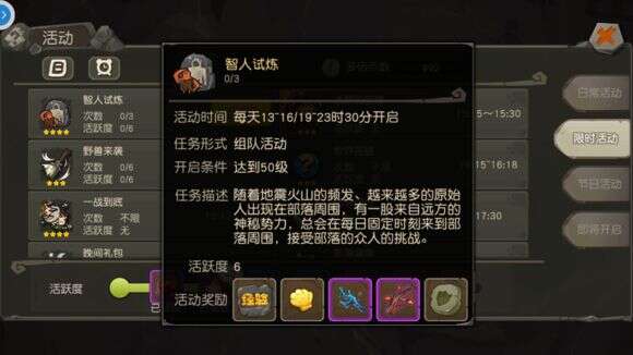 疯狂原始人手游智人试炼为限时活动,在每天的13-16时/19-23时30分开启,必须组队才能参加,在玩家等级达到50级的时候开放。