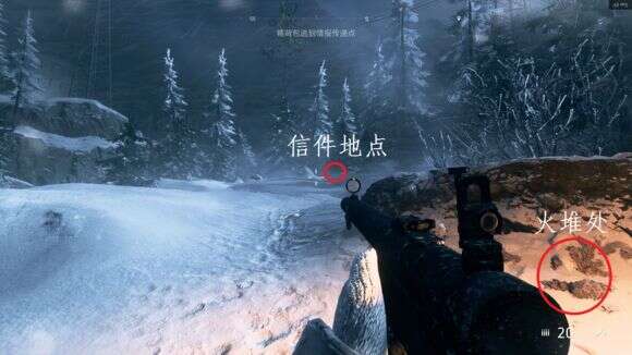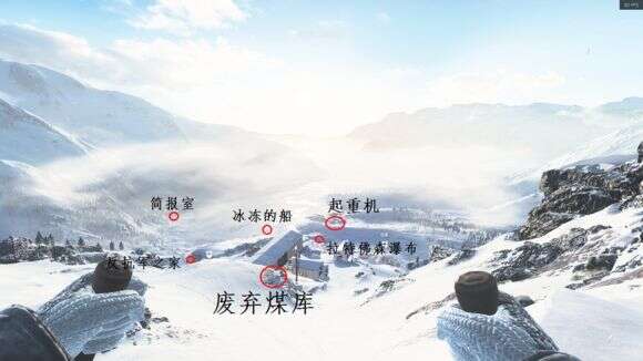 主角视野一片光明,首先全图讲解“信件”分布。最近处,就是滑雪女主起点位置屋子悬崖下的【废弃煤库】