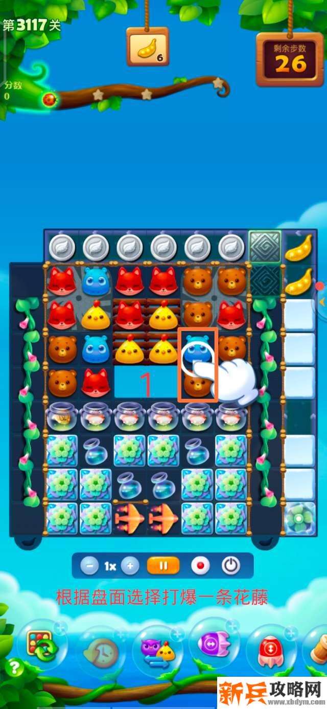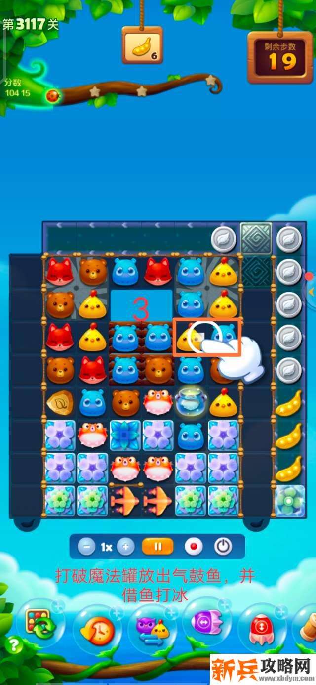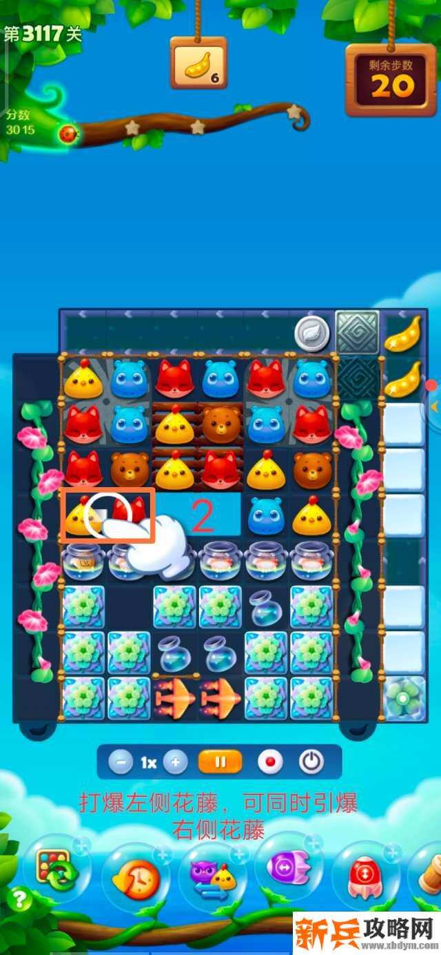 1.根据盘面,想法打爆两侧任一条花藤,进而引爆另一条花藤,消除两侧冰块和大部分魔法罐,放出气鼓鱼;