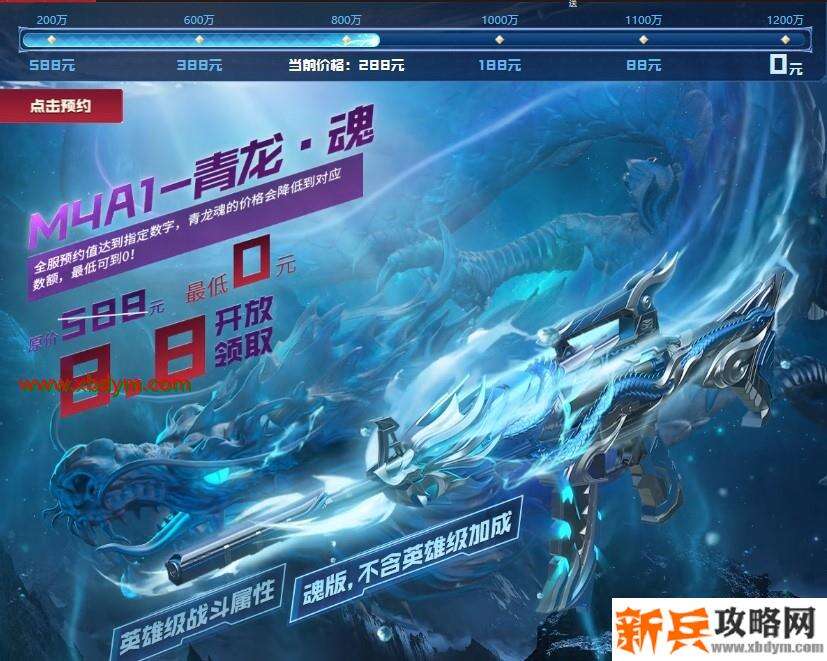 CFM4A1青龙价格是通过参与预约活动的人数确定,预约人数达到200万时,M4A1青龙的价格是588元。预约人数达到800万时,M4A1青龙的价格是288元。预约人数达到1200万时,即可免费领取M4A1青龙·魂。