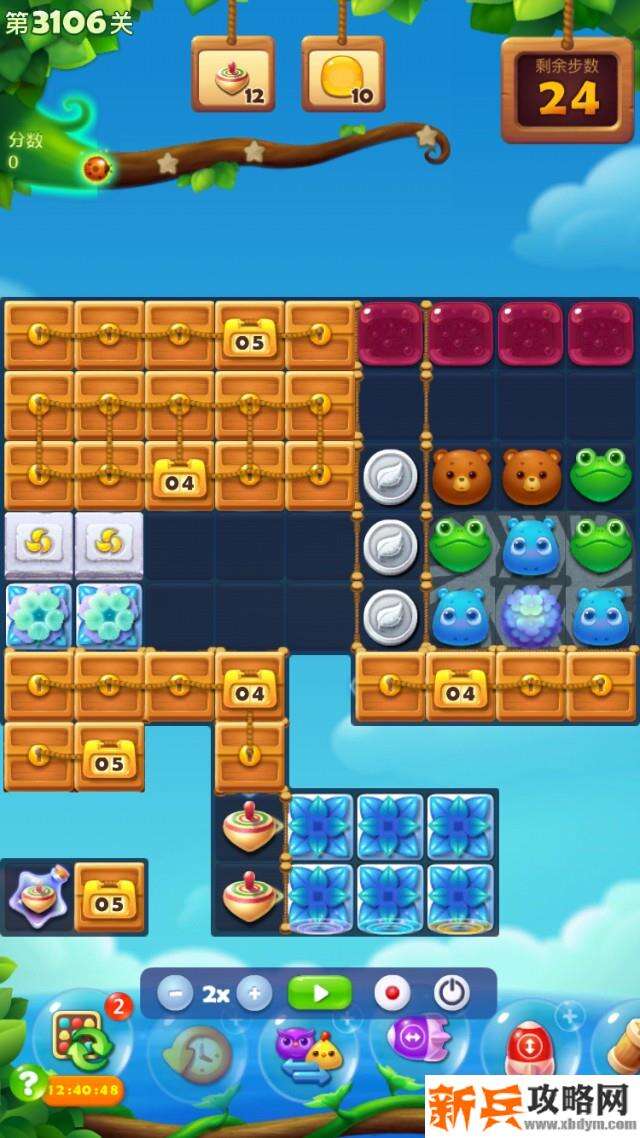 固定开局,右上方激活花团,消除右上方的毒液,让动物和钥匙掉落,收集钥匙🔑,解锁箱子区域,收集金币点亮左下方的魔法石,魔法石与小黄鸡交换,激活左侧和竖直的陀螺,激活蜂蜜罐,释放蜂蜜,收集蜂蜜,注意适当的蜂蜜数目,收集蜂蜜,步数不多,烂尾严重,多来几次,效果不错,祝福好运!