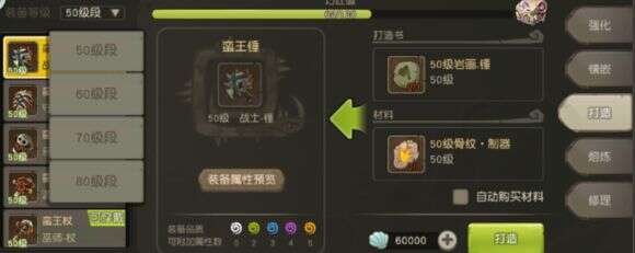 1.由于该游戏的装备是更新换代的,也就是说你40-50级要穿一套40级的装备,50-60级要穿一套50级装备,60-70级要穿一套60级装备,也就是说装备是更新换代的,要在装备面板进行新装备打造。如图所示,勾选自动购买材料系/统会自动帮你购买打造材料,然后按打造就完事儿了,也可以提前打造出后面等级的装备等到等级到了之后给自己穿上就行。