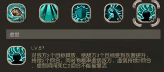 虚弱是守护者满怒气的大招技能,这个技能的强大之处是使敌人受到的伤害增加,两个回合是限制条件。这个技能最大的特点在于能够控制复活,当遇到奶妈和能够复活的豚眼蛙的时候,盾也是有一战之力的。