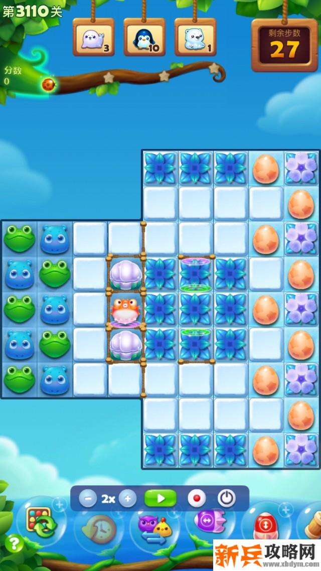 固定开局,左侧消除雪块,激活气鼓鱼,向右推进,消除冰层,雪层,冰块,收集鸡蛋,最右一侧冰层太厚,很难消除,需要充分利用页面组特效,消除,消冰后,释放海洋生物,步数不多,烂尾严重,需要积攒运气,祝福好运!