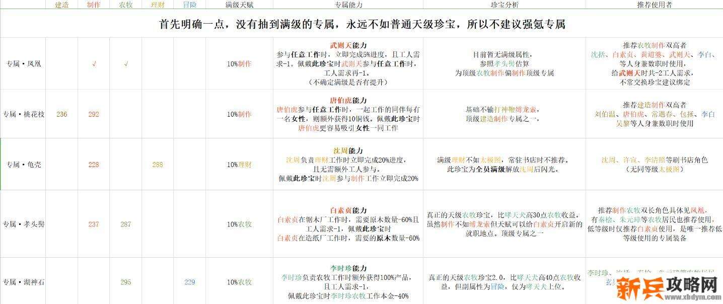 首先介绍专属天级珍宝(卡池专属),专属天级珍宝给对应人物佩戴有特殊加成,目前专属珍宝在满级时属性普遍优于非专属珍宝,但非满级时仅推荐白素贞专属孝头髻(国服未出)。顺便一提,在没有全员满级时不推荐沈周放弃太极图使用龟壳。