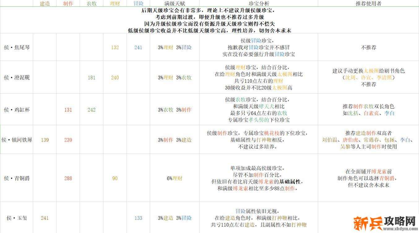 侯级珍宝,侯级珍宝不推荐前期消耗大量矿石升级,但依旧有两三个珍宝属性不错,例如鸡缸杯、镇河铁犀、青铜爵,前期过渡20级即可,建议等待土行孙白嫖金装,等以后矿锭溢出再升级不迟。