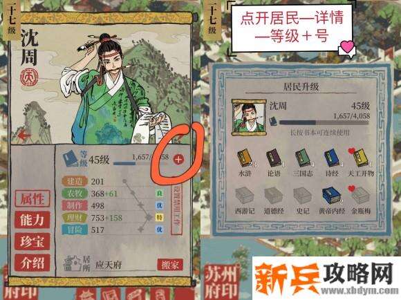 点击居民——详情——经验——点+号就可以给人物读书加经验了。