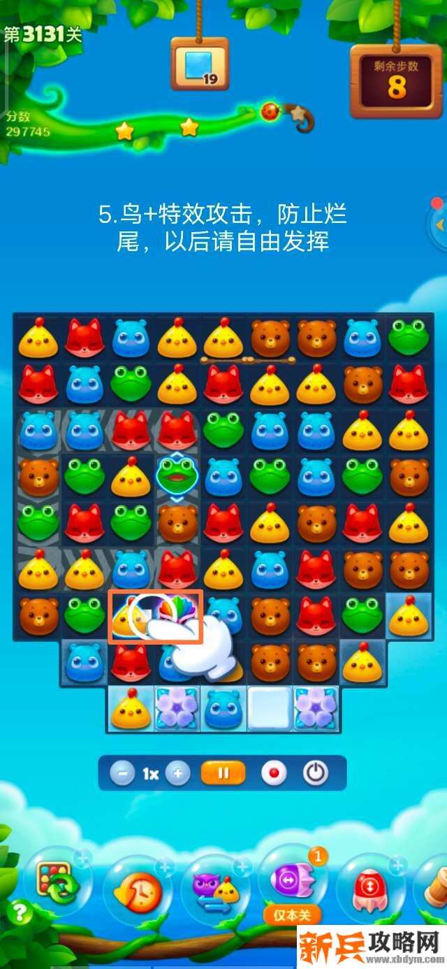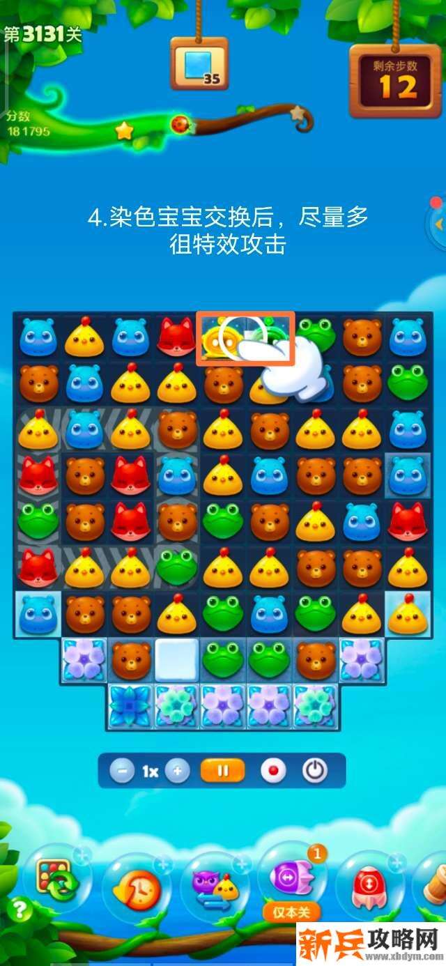 4.伺机交换染色宝宝,若有鸟形成,可组鸟+特效攻击,继续扩大空间,若无鸟成,则想法组合特效攻击,防止烂尾!祝好运,加油!