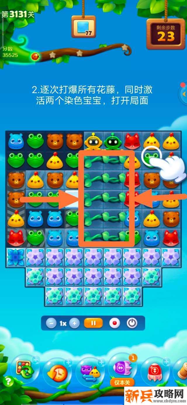 2.逐次打爆所有花藤,同时激活两个染色宝宝,打开局面;