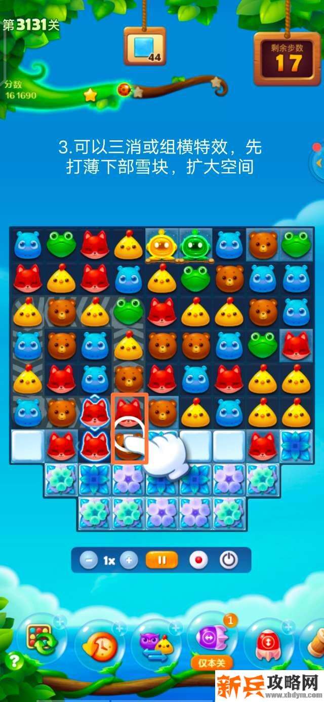 3.可先以三消或组横向特效打薄下部雪块,扩大空间;