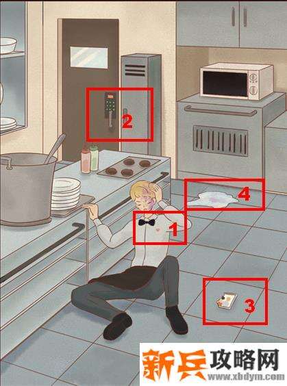 依次点击提交男人衣服上的唇印、门上的密码锁、地上的照片、地上的水渍。