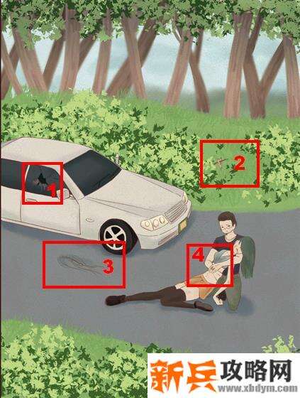 依次点击提交破碎的车窗、草丛中的衣服布料、地上的头发、男人的手。