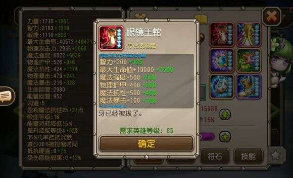二觉装备加的属性依旧继承了流行趋势,身板不够属性来凑,面板跟加成数据大家看图就好了,这里还是挑重点说。首先智力法强法爆等输出属性基本上就是个添头,毒狗技能还是以控制为主,就一个输出技能,系数也不高。而提高的生存属性,17500点生命,600护甲和900点魔抗算是十分不错了,毒狗的大多数情况下的任务就是活着,第一个棺材不被打断,然后运气好毒死一个不亏两个血赚,当然美中不足,毒狗的5点闪避还是硬伤,没有得到补足。面板来说,7.5w的血量1200+的护甲和1500左右的魔抗在中排非泰坦英雄算是顶尖了(携带+2斗牛),而五星毒狗的面板血量更是达到了9w点左右。
